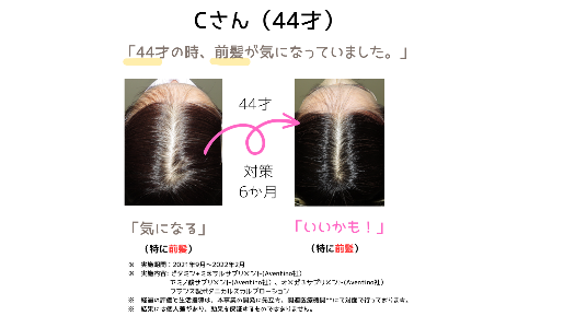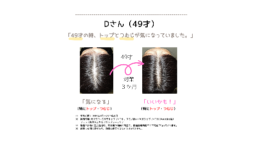 ご自身の状況に応じて、適切な対策が実行できると、ミノキシジル外用剤を使わなくても、下記の方のような見た目の違いが見られます。